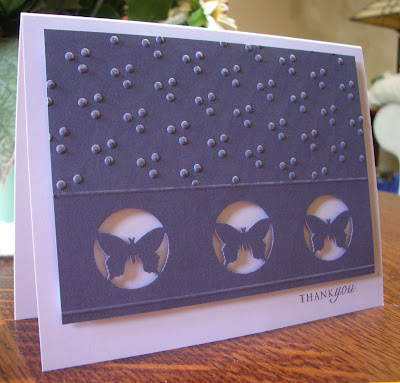 At our Group Gathering, a few ladies brought items they wanted to sell or give away. The butterfly punch I used for this card was in the "give-away" pile of Vicki's. Isn't it great? When you punch, the butterfly stays in the circle. After punching three of them in a row, I used a Sizzix embossing folder to emboss the top, and my Scor-Pal to add the lines above and below the butterflies. The sentiment is from Papertrey Ink's Anniversary set called Round and Round. Harriet had earned two of them, and she surprised me totally by giving me one when she came to visit!! What a super friend!! The cardstock and ink are Stampin' Up!'s retired Vintage Violet. I popped the entire violet piece up on Pop Dots.