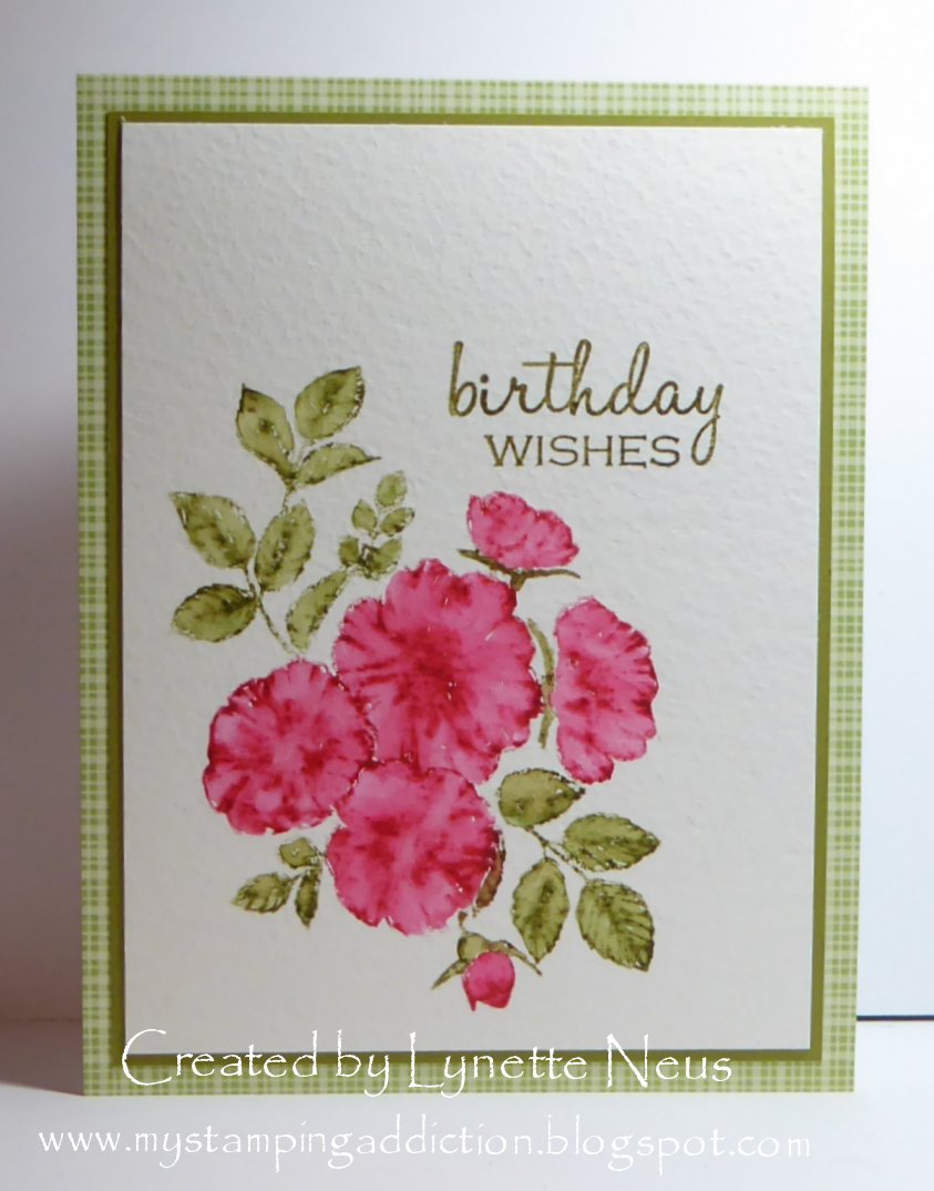 When I'm walking on my treadmill each morning, I often watch stamping videos. I usually forget to try out what I've watched, but this time I actually did. It was by Jill Foster, I believe, and it was the first time I'd heard of her. She used Arteza markers, but I used Zig Clean Color markers. I used the Zig markers directly on the stamp and then stamped on watercolor paper. Then I took a small watercolor brush and water and went over the image. I really like how it turned out. If I were artistic, I would have added something more, especially in the flower centers, but I didn't want to take a chance of ending up not liking it. The image and the sentiment are both from Gina K. I used patterned paper for the bottom layer.