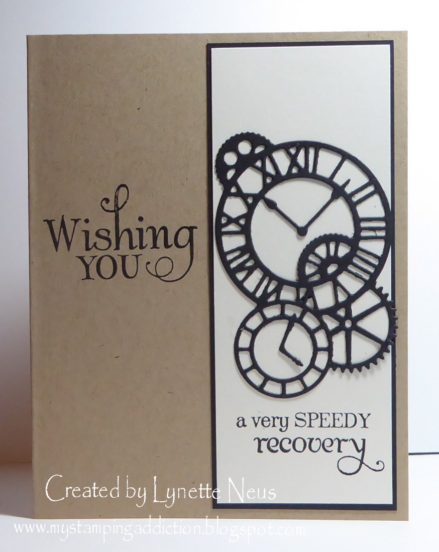 Our daughter-in-law's father recently had quadruple by-pass surgery. (He's doing quite well, from what I hear.) This is the card we sent him. I used a die for the timepieces. I placed it on an ivory panel and matted with black. The sentiments are from a Verve set. The card base is Papertrey Ink kraft.